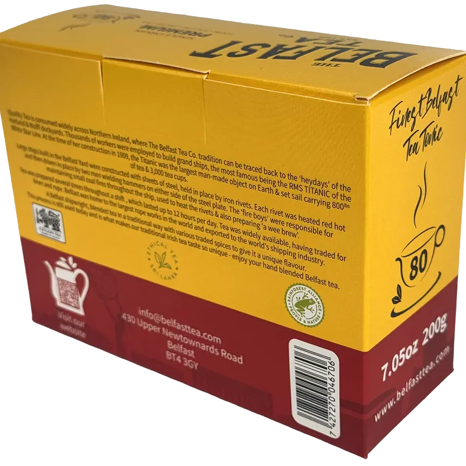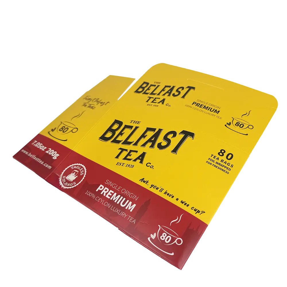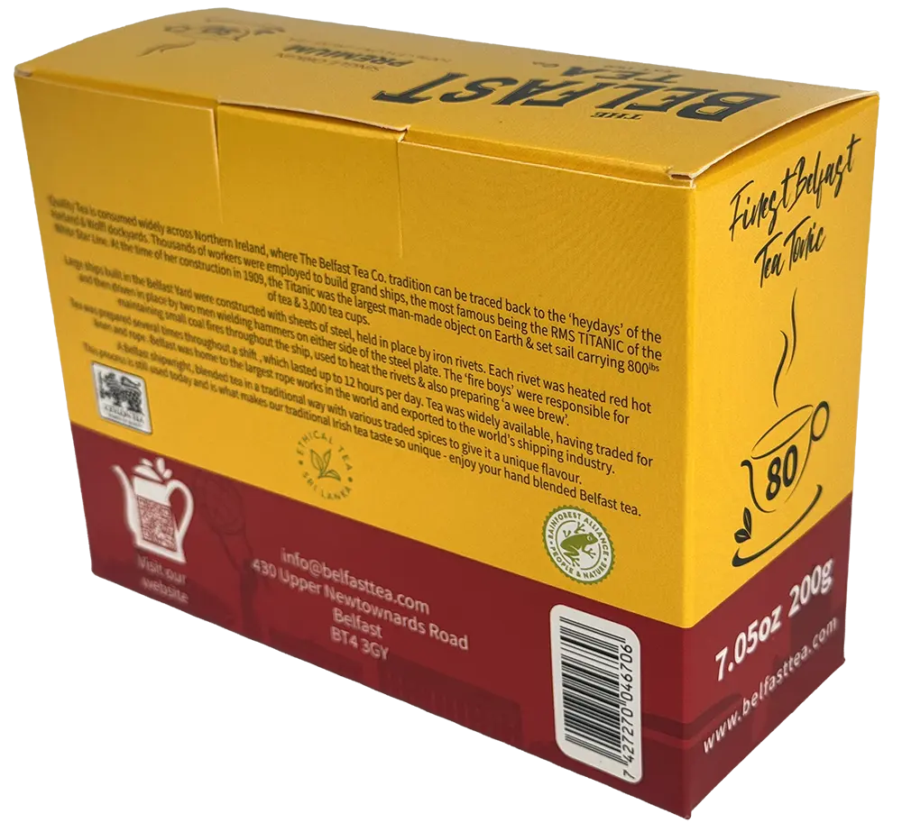 Belfast Tea Co., a heritage-inspired local brand celebrating Belfast’s long tea-drinking tradition, approached ESL Studio to create a bold, retail-ready pack for their 80-bag premium Ceylon tea range. They needed a design that honoured their historic roots, delivered strong shelf presence and provided a practical, durable carton suitable for automated or manual co-packing.