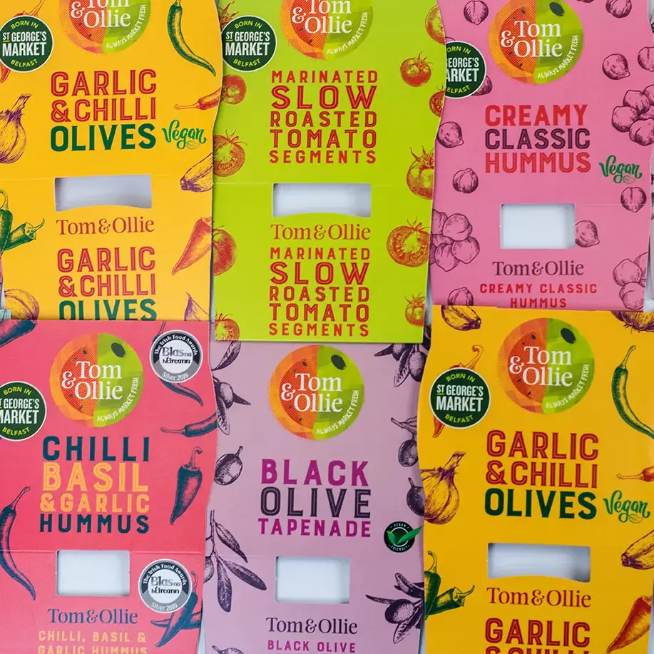 Tom & Ollie, a leading producer of artisan olives and Mediterranean-inspired foods in Northern Ireland, approached ESL Studio to create eye-catching printed packaging for their garlic & chilli olives. The goal was to design a sleeve that reflected their bold, flavour-packed brand while also providing a functional, protective cover for their retail-ready tubs.